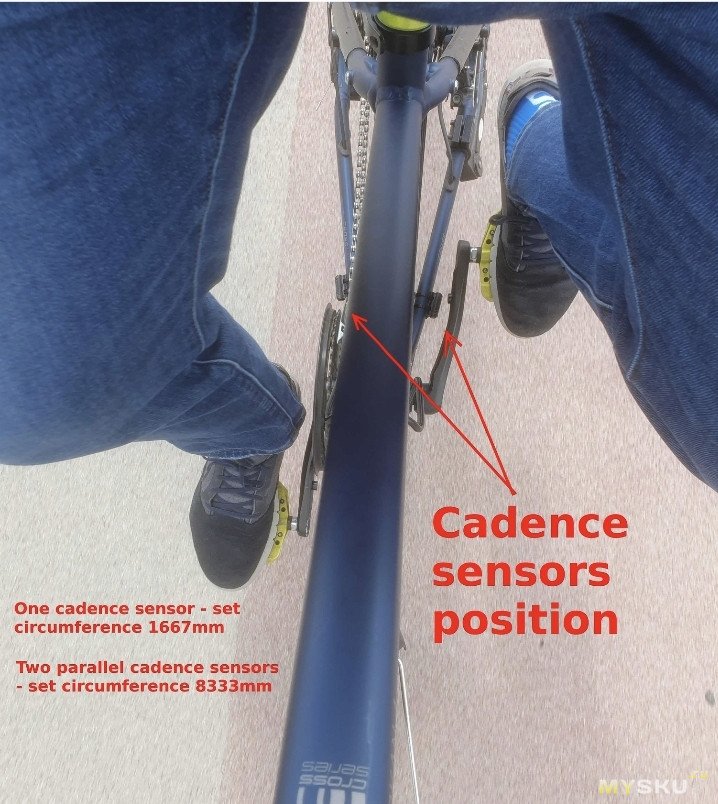 1) ленивый вариант, не требует даже удлинения провода датчика. Датчик с подиумом крепится на нижнюю трубу рамы. Магнит крепится на шатун. Забивается длинна окружности 1667мм (не зависит от велика). Каденс показывает с неправильной запятой, но доступны згачегия и выше 99 об/мин (на случай если вы чемпион)