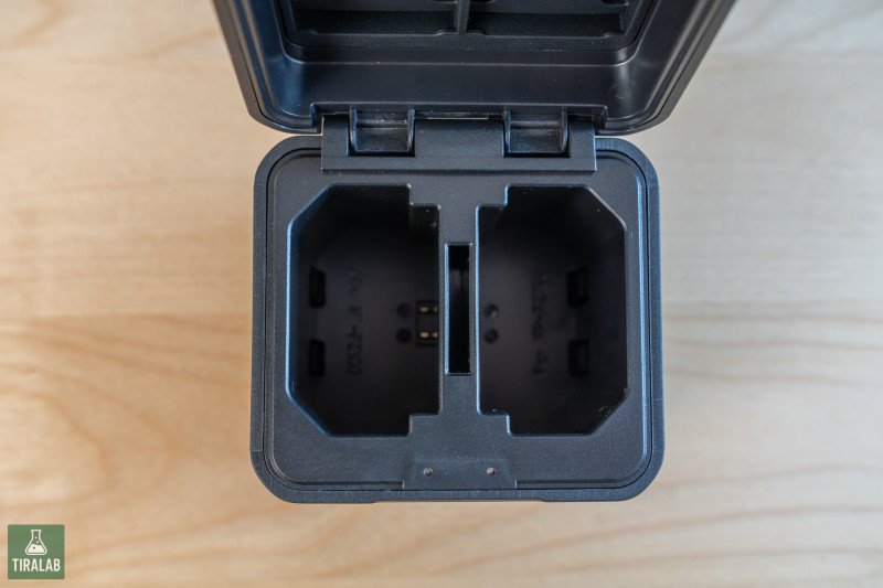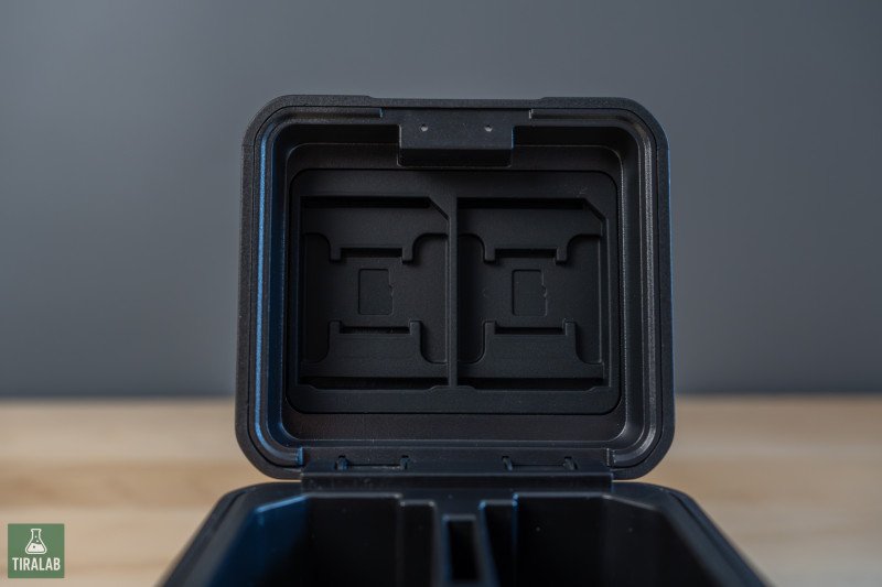 Открыв зарядку можно увидеть места для MicroSD и SD карты в крышке, а так же место под CFexpress type A между батарейками. Крепления в крышке прорезиненные и держат флешки достаточно надежно, и достать их можно только имея длинные ногти. Флешка между батарейками болтается без креплений.