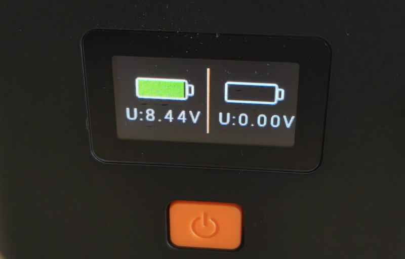 Спереди есть единственная кнопка управления которая лишь включает экран если он погас, и все. Экран при этом показывает напряжение на батарейке а так же рисует саму батарейку, и все, ни тока ни процентов.