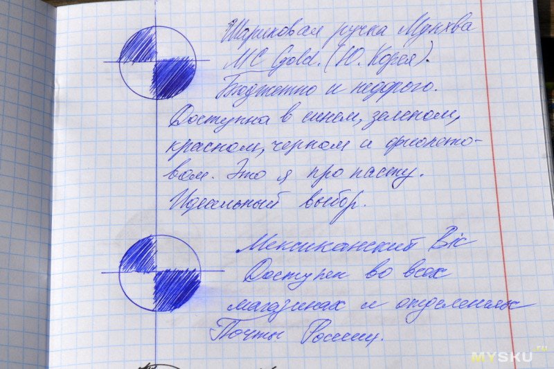 Для своих конспектов я бы не стал выбирать такую тетрадь. Мне не нравится, когда текст просвечивает и мешает другим записям. Предпочитаю более плотную бумагу, чтобы она не мялась в руках и переваривала шарик и перо.