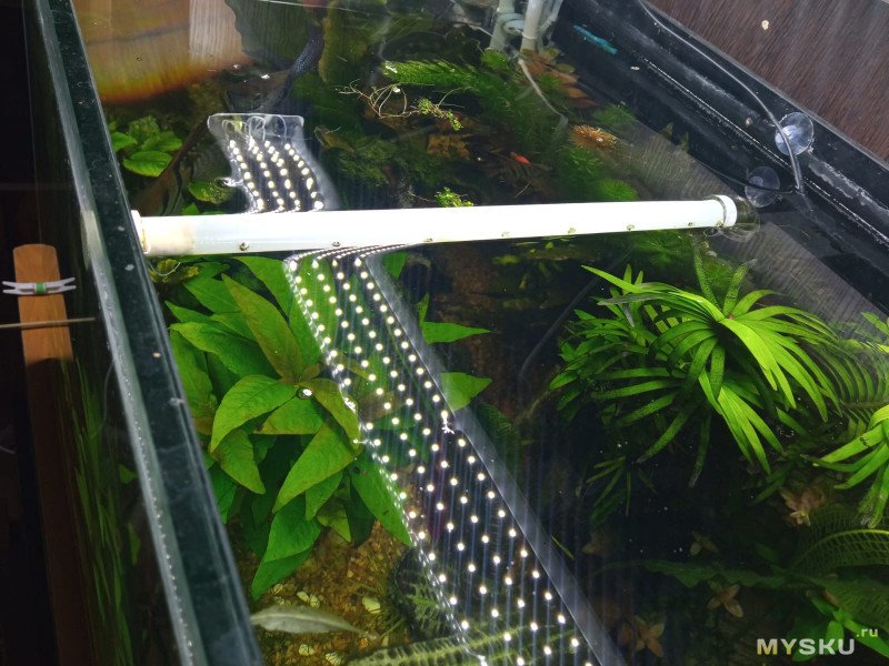 Высота моего аквариума позволила установить только три модуля с губками. Насос с увеличением фильтровального столба справился отлично.