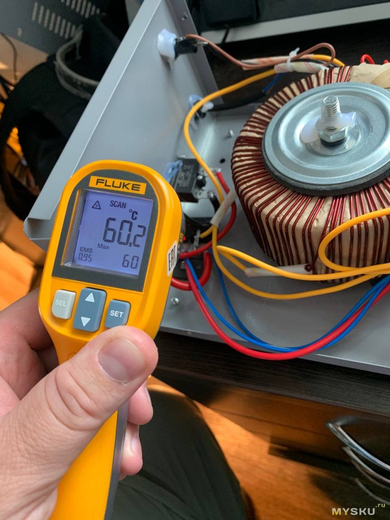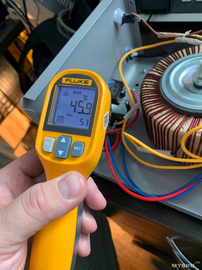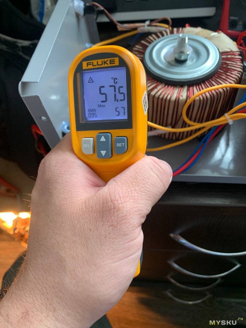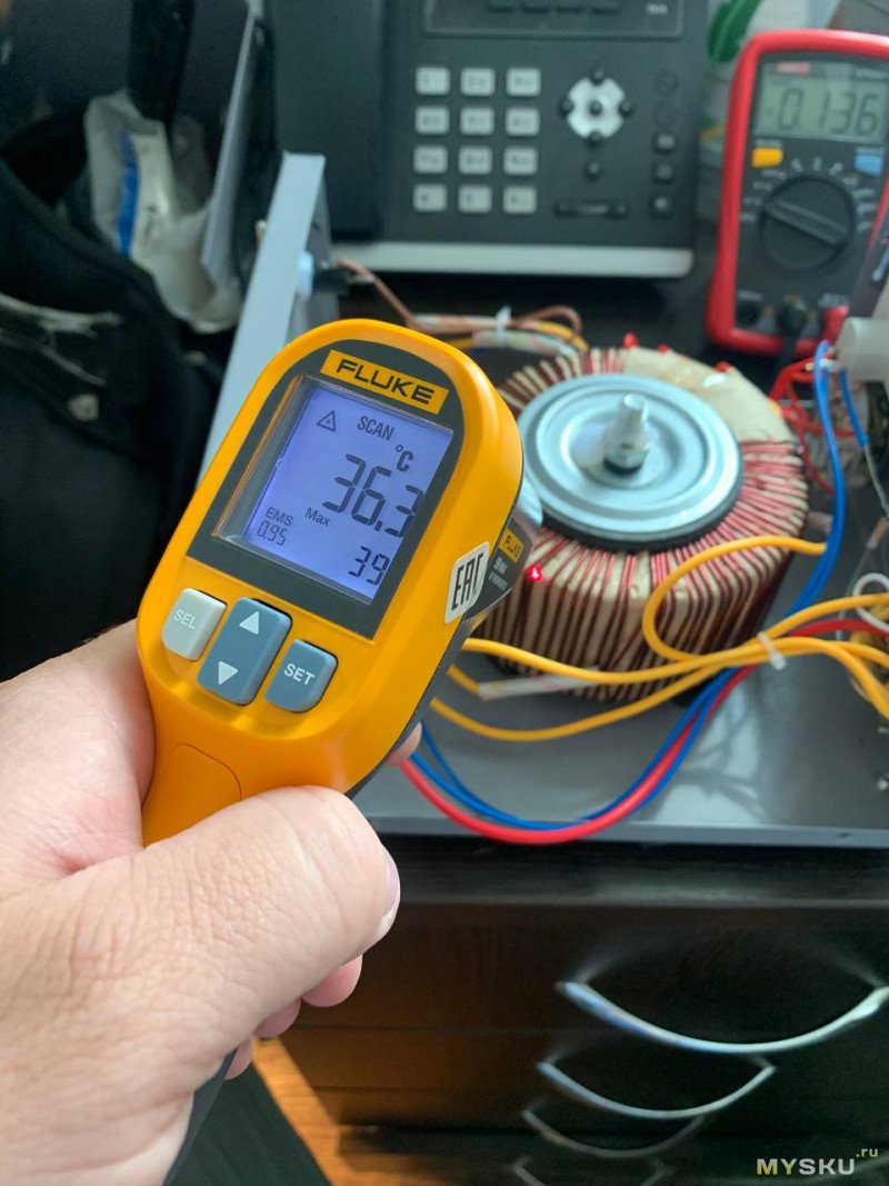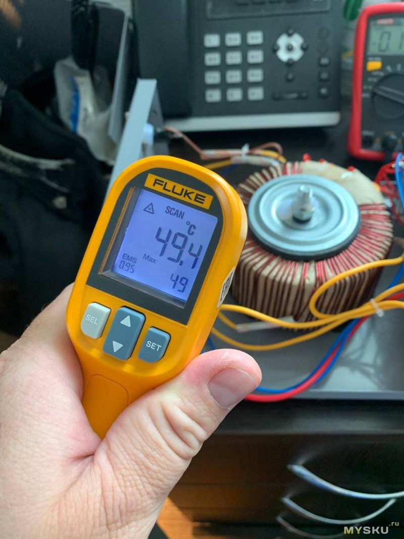 8:44, трансформатор нагрелся почти до 60, трогать его руками стало горячо.