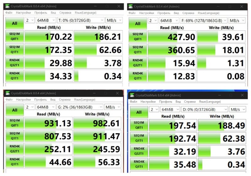 D8 Hybrid позволяет настроить пару HDD в RAID 1, а дополнительные SSD использовать в качестве хранилища быстрого доступа — скинуть что-то (фото/видео и прочее медиа) для освобождения места на ноутбуке. По скоростям — тут зависит от скорости доступа к конкретному диску. У меня сборная солянка разного старья, скорости разбегаются от 180...400 МБ/с на запись в HDD (на забитых дисках скорость может еще и сильнее падать, например, до 50 МБ/с), до 800-900 МБ/с на SSD. Быстрее, чем на SSD по USB, у меня пишет только на встроенный накопитель ноутбука, так что скоростей достаточно, тем более речь идет не о постоянной записи/перезаписи, а об однократном создании бекапа с последующим его пополнением актуальными документами/файлами.