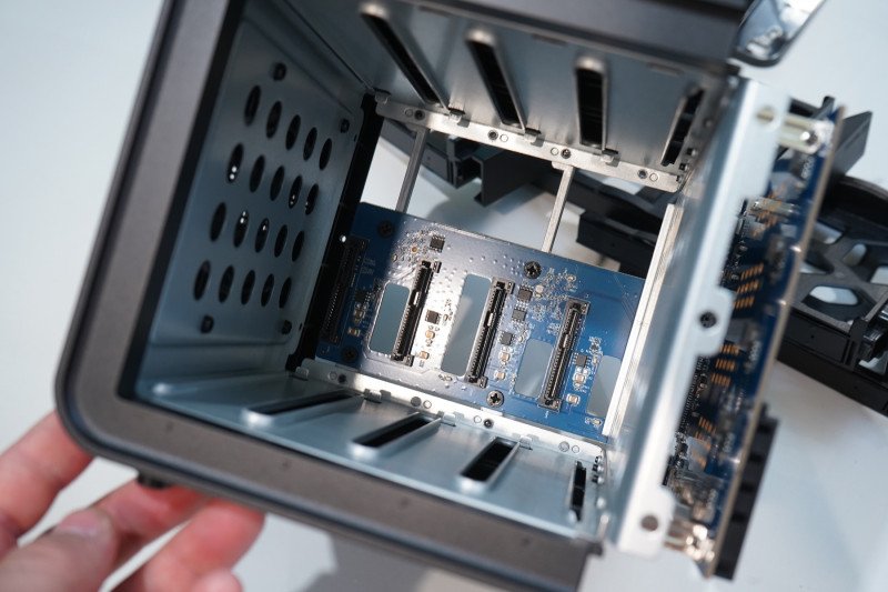 Прикладываю фото внешнего вида, внутрянки (салазки для накопителей с быстрым доступом, слоты М.2 для SSD), есть охлаждение для накопителей. Отмечу оригинальный (бесплатный) софт Terramaster TPC Backupper для автоматизации задач копирования/актуализации бекапа. В текущей ситуации это вполне нормальный и рабочий вариант, в перспективе с удешевлением SSD/HDD докуплю накопителей пожирнее, но это уже другая история. В целом — доволен, можно брать, если не требуется сетевой доступ для разных устройств.