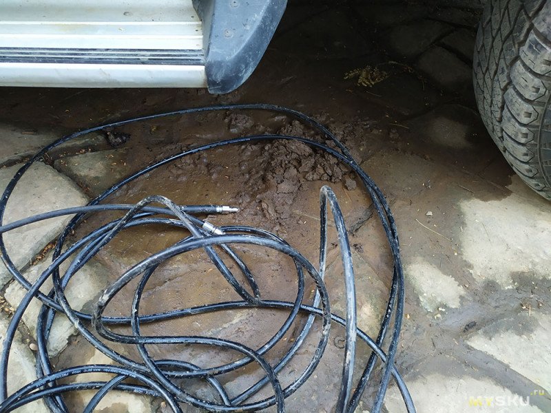 Явно не хватает давления и особенно расхода воды, поэтому процесс ну оченьувлекательныйдлительный. Приходилось периодически засовывать садовый пистолет к отверстиям, чтобы потоком воды вынести собравшуюся кучей грязь.