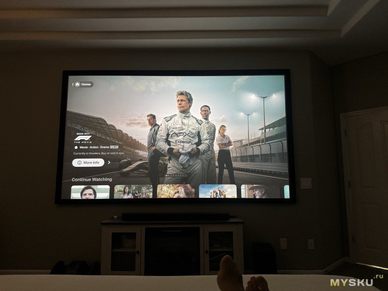P.S. я бы и 150 дюймов экран сделал бы, если бы длина помещения позволяла, но 128 тоже устраивает. В прошлом доме у нас спальная была длиньше, там на стену проецировал 145" с этим же проектором.
