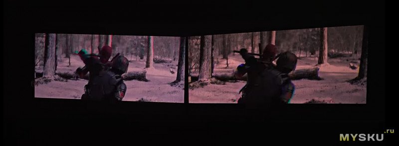 в целом тоже самое я видел глазами на fengmi s5. а если головой помотать или резко повернуться — то картинка на радугу распадается на доли секунды. то есть надо смотреть не отрываться, и в динамичных контрастных сценах один фиг такие артефакты были… я так понимаю и на 3-лазерных dlp тоже самое… да, меньше чем было на старых ламповых dlp, но есть…