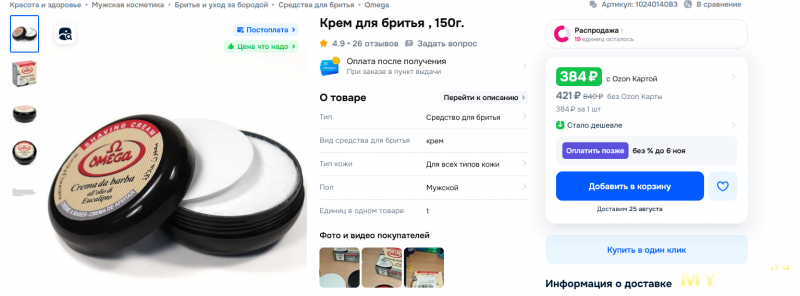 Судя по адресу сайта, Omega больше специализируется на помазках, чем других бритвенных принадлежностях. Кстати, на Озоне помазки Омега стоят сейчас недорого, но что-то не вызывают доверия, в отличие от обозреваемого мыла)))