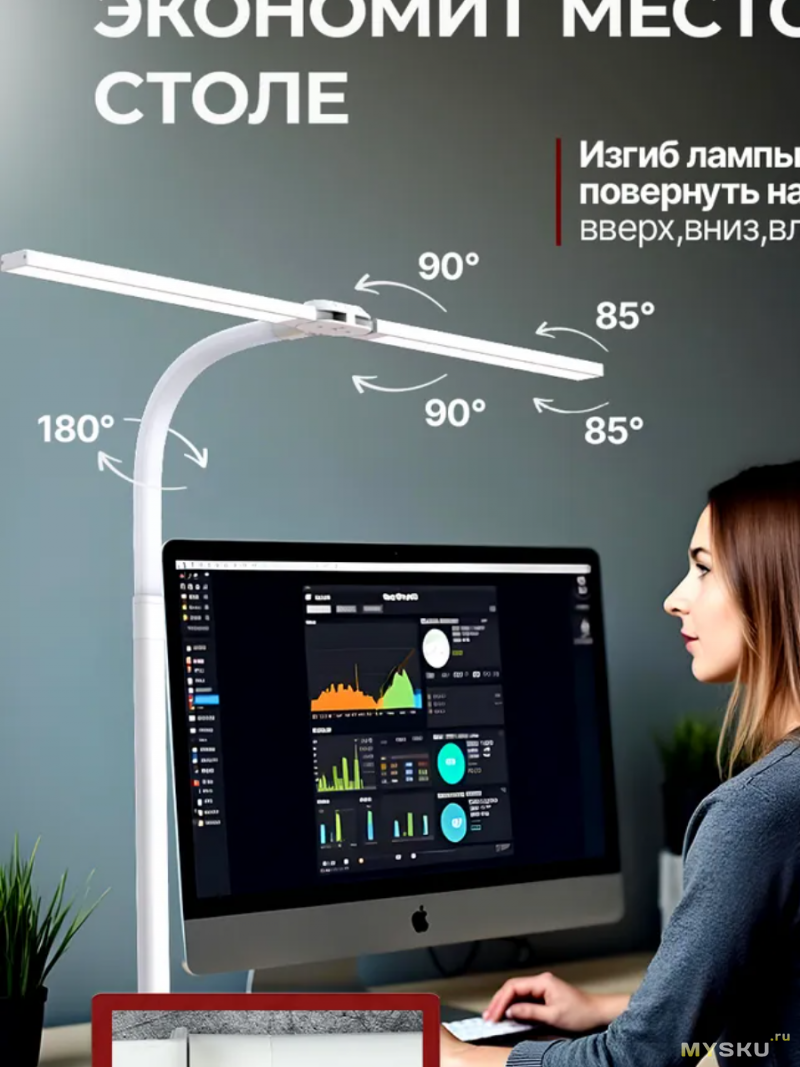 Большая светодиодная лампа с обширной площадью освещения рабочего стола. Благодаря углу освещения в 45 градусов резко снижено наличие бликов и уменьшено количество теней. Работать за столом при освещении стало удобнее. Есть регулировка яркости освещения и цветовой температуры, а также автонастройка яркости. Светодиоды потребляют мощность до 16 Вт. Уровень светового потока до 1000 лм. В наличии два варианта крепления на столе – подставка или зажим на краю столешницы.