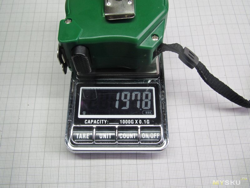 В целом внешний вид и качество изготовления вполне на уровне. Размеры где-то 65х65х35мм без клипсы, клипса еще миллиметров 6.5 добавляет. Вес 200 грамм. Выдвигается плавно, сворачивается уверенно. Есть два стопора — нижний просто кнопка без фиксации, верхний — с фиксацией. Длина 5 метров, ширина 25мм, толщина ленты всего 0.1мм — ну или штангенциркуль врёт. Но при этом ленту можно выдвинуть на 2.5 метра, и она вполне устойчиво держит форму и не падает