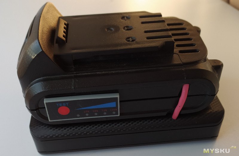 Батарея весит 260г и внутри только 5 из 10 возможных элементов. Место под индикатор уровня заряда обозначено формой пластика. Кроме того нет зарядного ножевого контакта (хотя площадка на плате для него оставлена, но без отверстий), так что зарядка только через цилиндрический разьем 2.1*5.5.