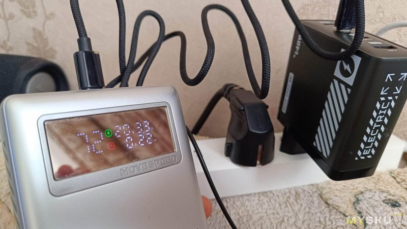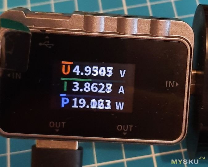 Ну что же, даже чуть больше, чем было заявлено — 20,04 Вт по протоколу PD 3.0. Теперь проверим максимальную мощность зарядного устройства под нагрузкой при помощи повербанка MovieSpeed мощностью 100 Вт и того же тестера.