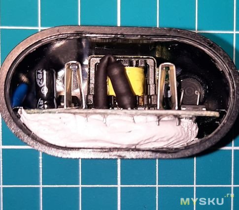 разбирается зарядка легко, часть с вилкой отделяется от основной в тисках без проблем. Внутри видно интересную систему охлаждения