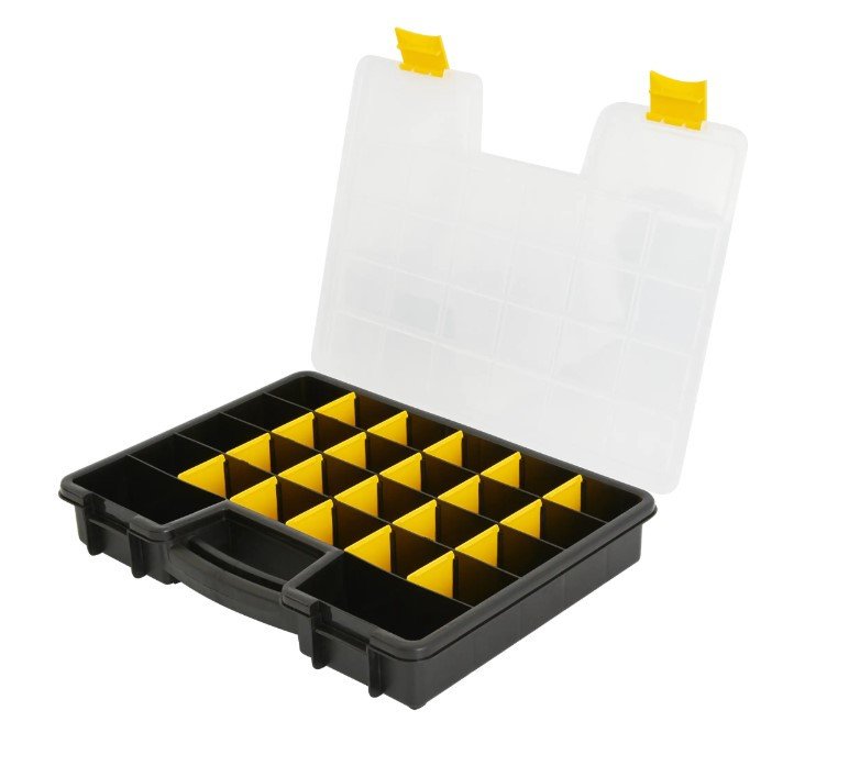 В моём шкафу для разных инструментов и деталей используются пластиковые коробки для обуви (так их позиционировали), а в них, под мелочь, отдельные емкости. Многое уже разложено, но для оставшегося был приобретён новый органайзер который отлично встаёт в коробки или может быть размещён отдельно.