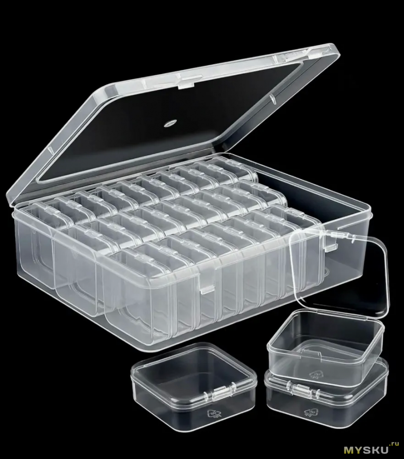 Привлёк внимание такой вот органайзер. Состоит из двух идентичных, соединенных петлями. Скрепляются между собой защёлками. При этом можно и рассоединить используя порознь. Внутри отдельные, вынимаемые, ёмкости трёх размеров/объёмов. Мне показалось, что это лучше чем перегородки: достал «стаканчик», высыпал, отобрал нужное, вернул обратно. Когда оба контейнера скреплены то специальные углубления формируют ручку/захват для переноски. Приэтом этот объём тоже можно использовать для хранения.