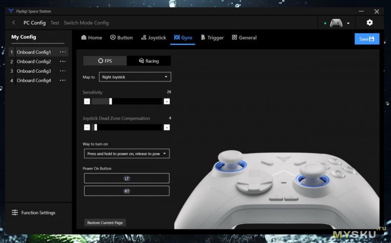 В ОС Windows устройство определяется без проблем и без необходимости загружать драйвера. Распознаётся, как контроллер Xbox 360. Стороннего персонального софта для работы с геймпадом не предусмотрено. Все описанные в инструкции тонкие надстройки можно настроить на самом контроллере на нативном уровне — калибровка стиков, турбо-режим, вибрация, режим мыши, смена режимов между крестовиной и левым стиком. Режим турбо имеет три скорости (5/12/20 кликов в сек) и доступен для кнопок ABXY, для триггеров и бамперов. В режиме мыши курсор управляется правым стиком, а роль ЛКМ и ПКМ ложится на триггеры.