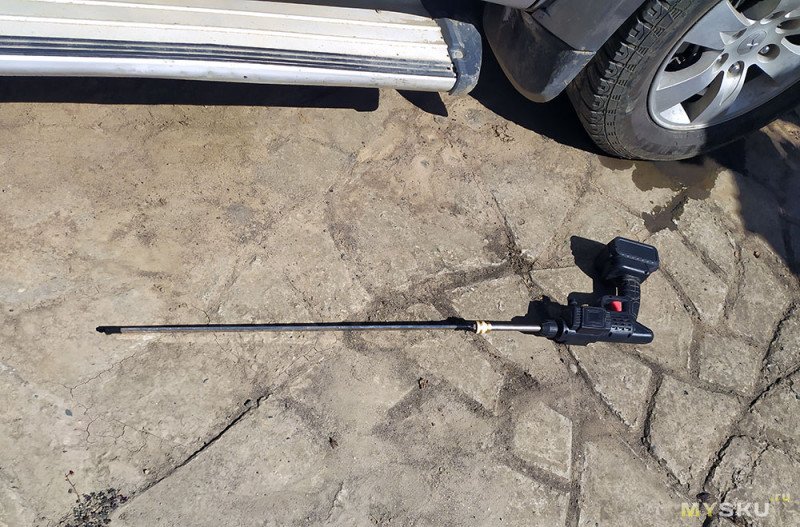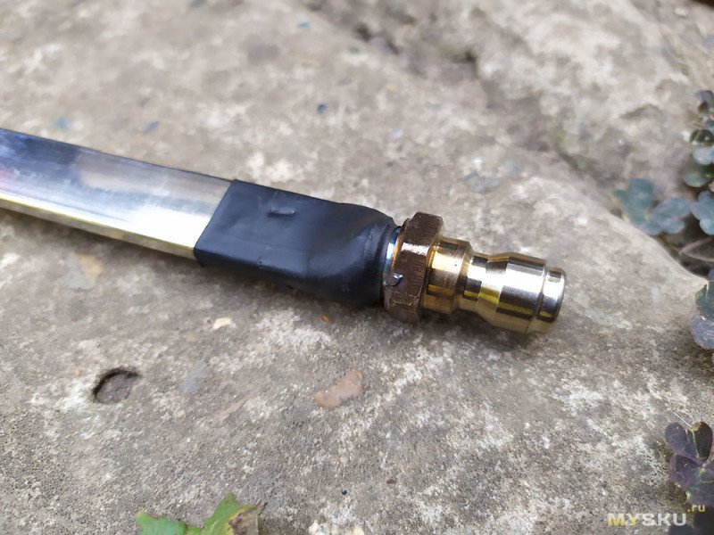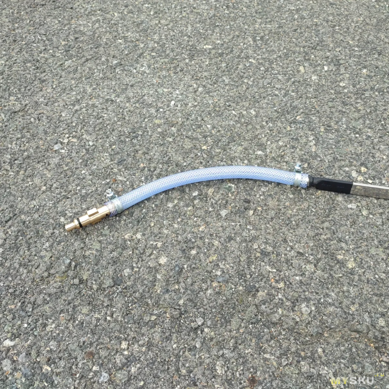 Минус, который сразу бросается в глаза — громоздкость получаемой конструкции, все гуляет и гнется. Относительно неудобно такое крутить/влезать в щели, учитывая что к пистолету еще и шланг подключен.