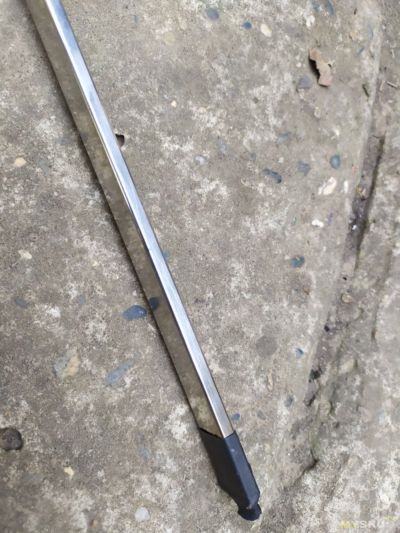 Обычная прямоугольная трубка из нержа (магнитится очень слабо) с несколькими отверстиями. Размеры 65см х 1.5 х 0.5