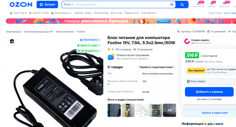 Продолжаем тему с народными БП от Foxline. На этот раз "Блок питания для компьютера Foxline 19V, 7.9A, 5.5x2.5мм,150W". Сохранил название от продавца