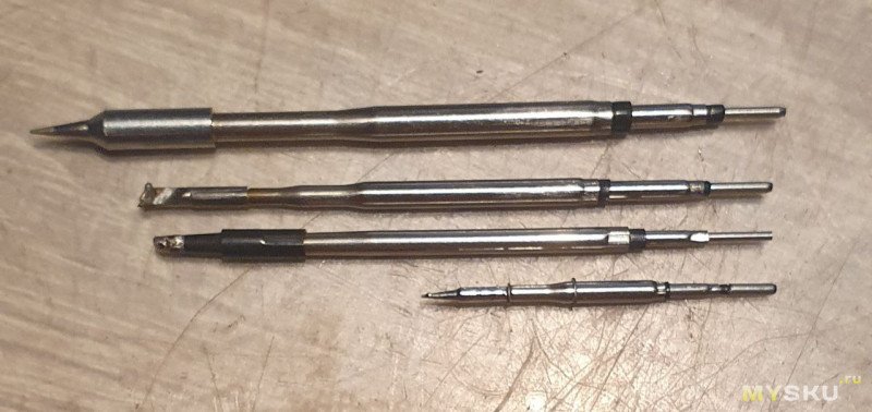 Три жала, острое, скошенное «пятка» и топорик. Жала похожи на JBC С115, сопротивление около 1-1.5 ома.