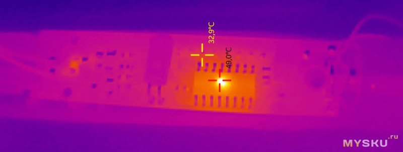 Управляющий чип со стёртой маркировкой. Посмотрел тепловизором — в середине чипа яркое пятно разогрева; наверное пробит выходной ключ. Еле заметное пятнышко слева — резистор в цепи питания трех микросветодиодиков подсветки.