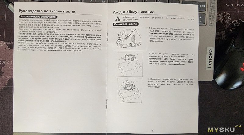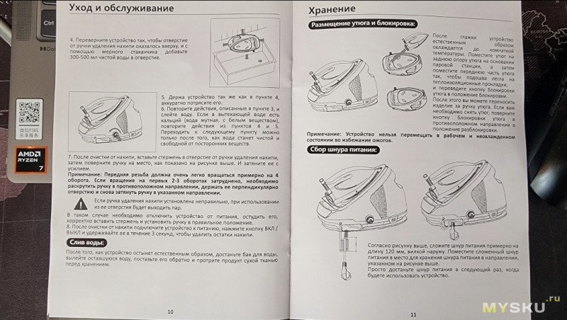 Давно смотрел на подобные штуки, если честно, но стоимость их «кусалась», а утюг парогенератор MIKO IS85 Ultimate со станцией оказался доступным вариантом. Сам по себе комплект компактный – по размерам он чуть-чуть превышает габариты обычного утюга, в первую очередь, за счет своей станции-парогенератора. Его особенности: это возможность как горизонтального (на доске), так и вертикального отпаривания. В коробке, помимо утюга и станции, была инструкция, а также мерный стаканчик для воды.