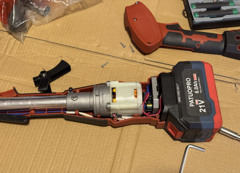 — штанга не разборная — перевозить неудобно (мне критично, т.к. несколько раз за сезон приходится на кладбище ездить — бурьян выкашивать). Хотя сделать штангу разъёмной производителю ничего бы не стоило — вала нет, только добавить копеечный разъём на кабель, соединяющий электронику и мотор…