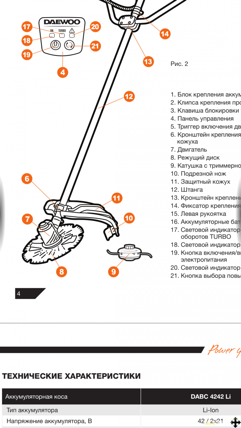 В комплекте два ножа, катушка с леской, два защитных кожуха, колёса, двухрядный аккумулятор, очень медленное зарядное устройство.