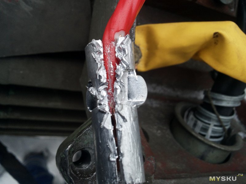Кабель сечением 70мм с гибкими жилами. Тоже разрезал место сгиба и ударами постарался сдвинуть гильзу.