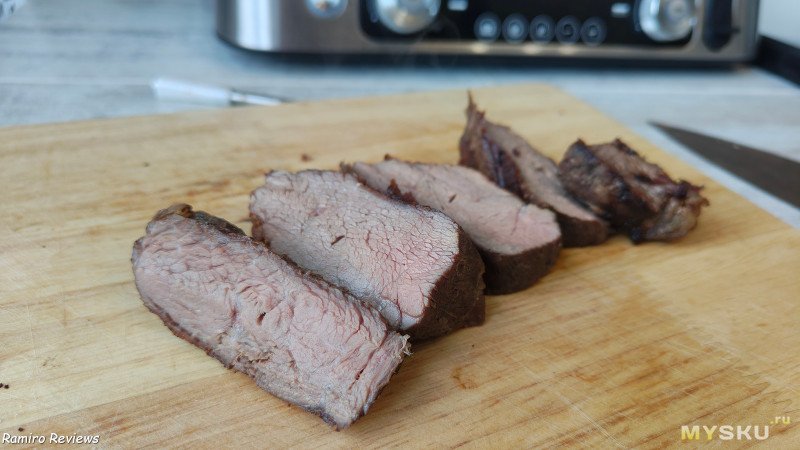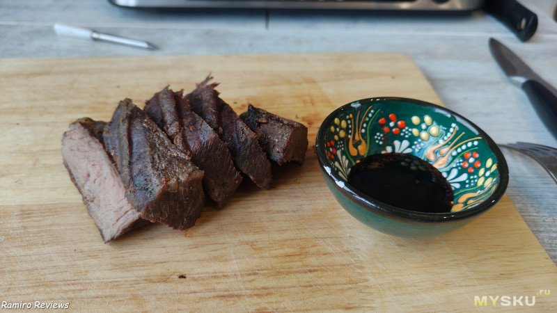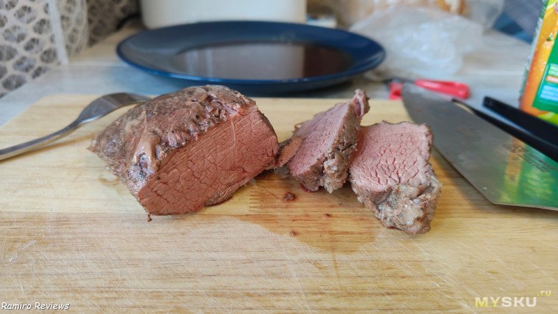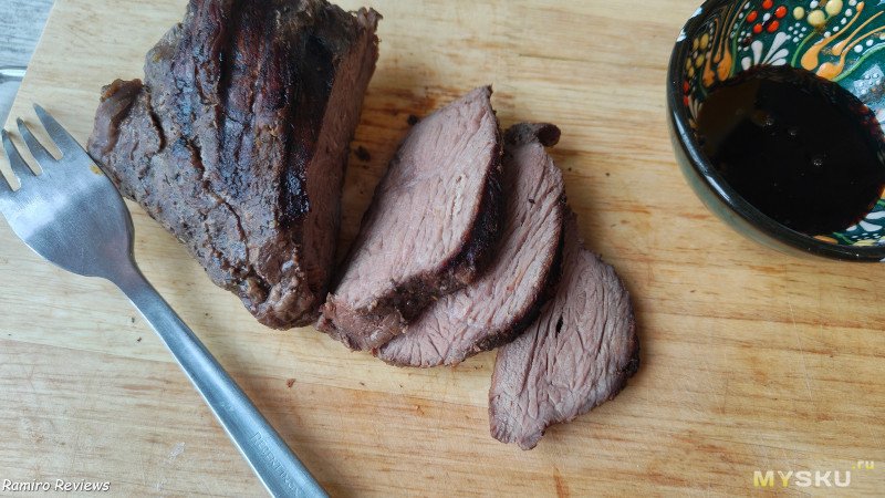 Кухню наполняет вкуснейший аромат специй и вкусного мяса. Есть что-то в этом такое магическое. Мясо сочнейшее, мягкое. Отрезаем и кушаем. Правда, вид мяса су-вид не такой гламурный.