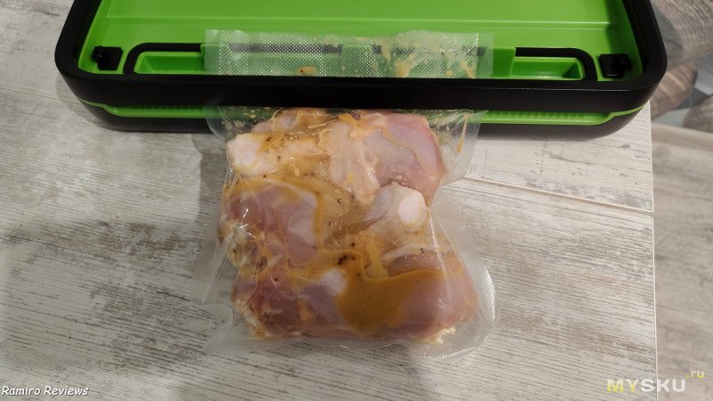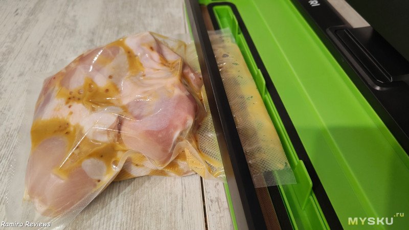 В комментариях узнал, что пакеты лучше брать рифленые, а вакуумировать надо рифленой стороной вниз. И лучше при влажном вакуумировании закатывать горловину пакета, как штанины, чтобы она не была влажной и всё запаивалось. Собственно, до этого я ничего из этого не соблюдал, и всё прекрасно вакуумировалось и запаивалось.