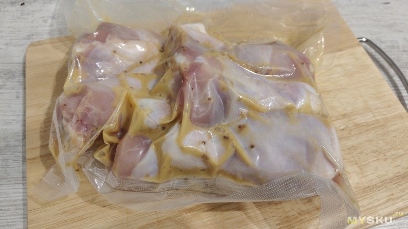 Берем ножку курицы, купаем в маринаде, вакуумируем.