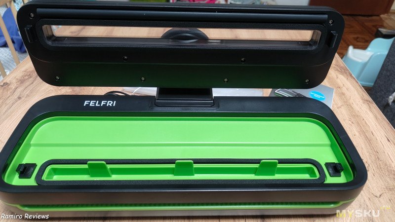 Причем данная модель вакууматора — именно с вакуумным отсеком внутри, она сама закрывается, притягивает и только после этого начинает процесс.