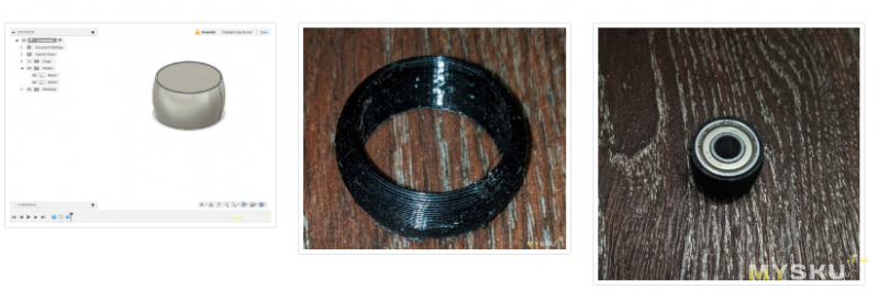 То ли у меня принтер глючит, то ли пластик отсырел совсем, но удалось напечатать лишь с третьего раза! ABS. Увеличил модель до 103% Не налезал ролик на подшипники.