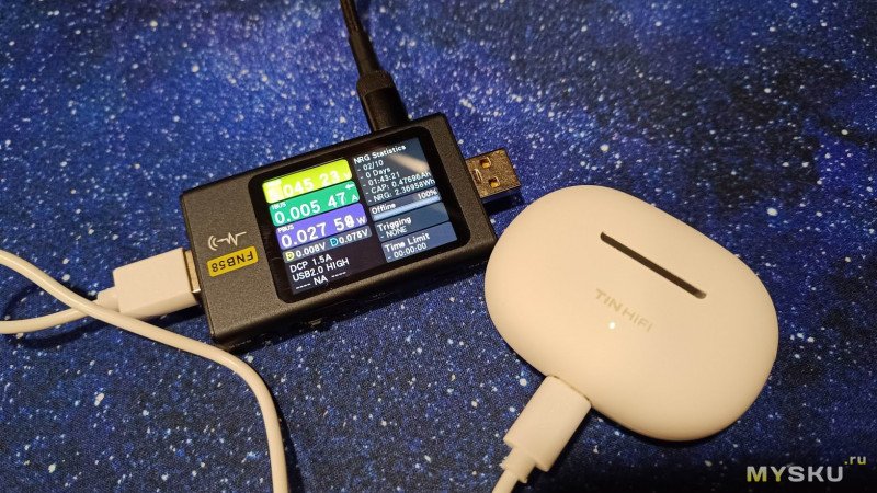 С зарядкой тоже всё оказалось не так просто, как ожидалось. Я подключил кейс от 4-х портового 105 ваттного зарядного устройства с поддержкой кучи протоколов быстрой зарядки. Однако зарядный ток не поднимался выше 0,033 А. Судя по всему, это потребление того самого светодиода на зарядном кейсе и никакой зарядки аккумулятора не происходит.