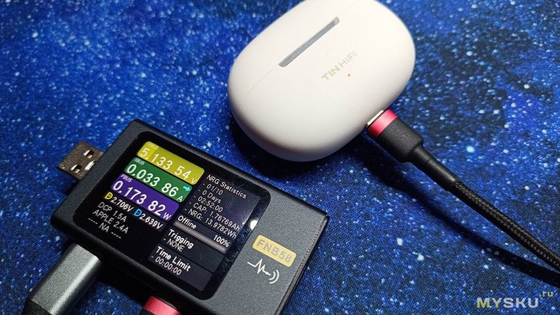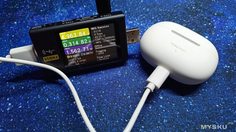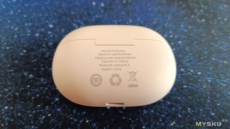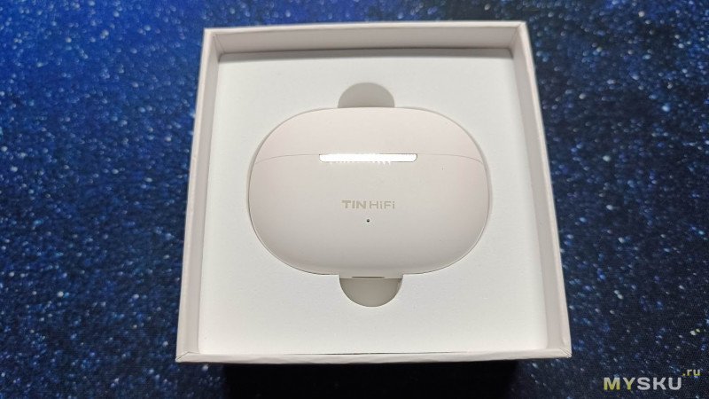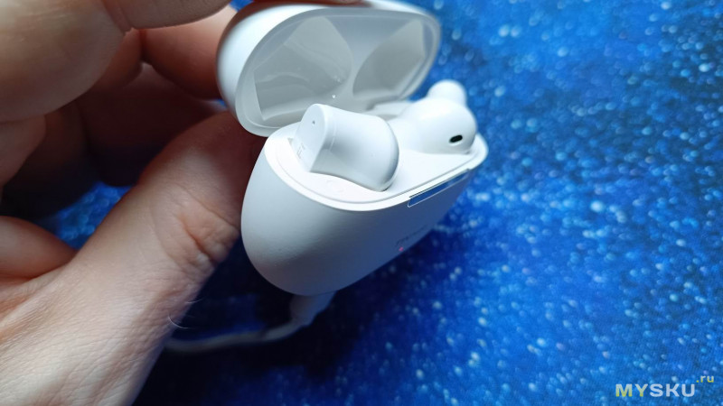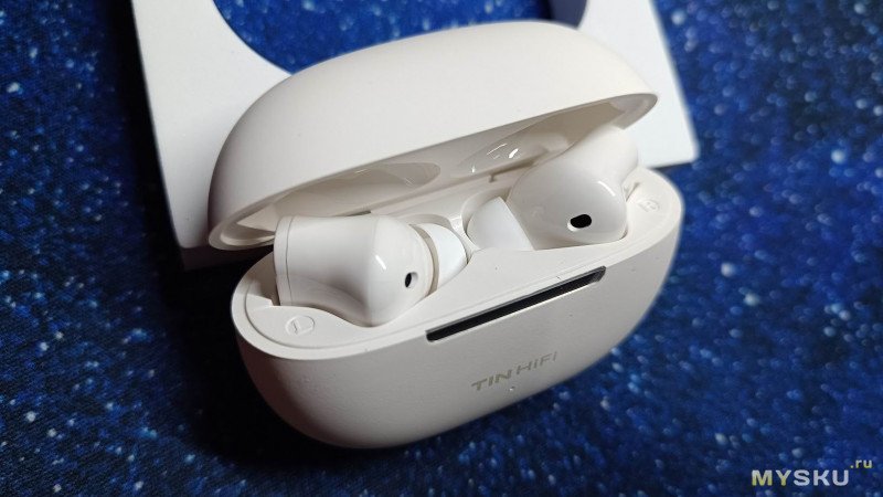 Наушники приехали ко мне полностью разряженными. Когда я поставил их на зарядку, то на кейсе загорелся красный светодиод, а вот у самих наушников световая индикация заряда отсутствует. Это неудобно, так как по индикаторам прежних наушников я определял необходимость чистки зарядных контактов, когда вставлял их в кейс. Загорается красный огонек зарядки — всё хорошо, горит белый свет сопряжения — контакта нет, пора чистить. Соответственно нет у TinHiFi TinBuds1 и индикации сопряжения по bluetooth.