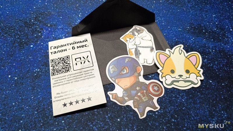 Внутри еще интереснее. Вместе с коробкой лежит сюрприз — небольшой чёрный конвертик, внутри которого оказался гарантийный талончик и три наклейки. Гарантийный талон обещает упрощённую 6-месячную гарантию по QR-коду.