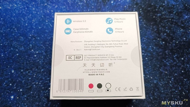 Коробка изготовлена из плотного мелированного картона. На обратной стороне которой указаны ключевые особенности устройства: передача сигнала по энергоэффективному протоколу Bluetooth 5.3, ёмкость зарядного кейса 320 мАч, ёмкость аккумуляторов в самих наушниках — 40 мАч, время работы на одном заряде 4 — 5 часов.