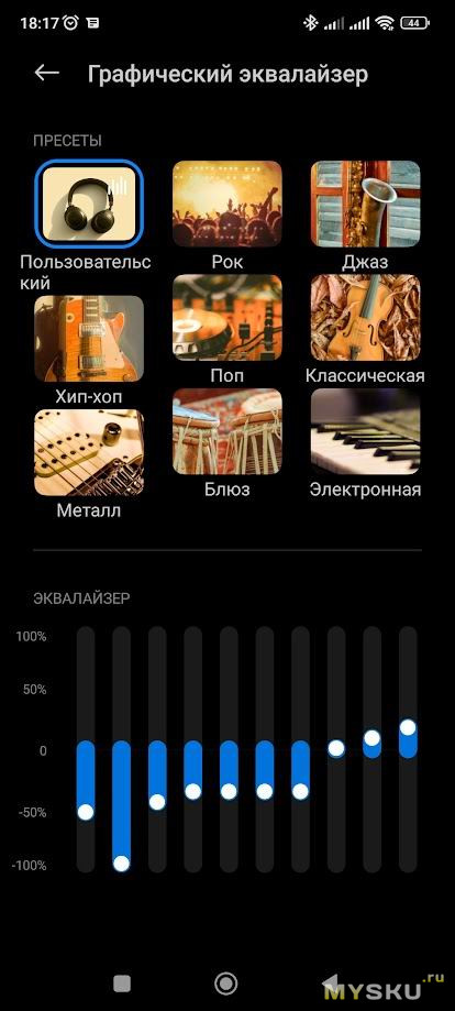 Что касается звука, то его дефолтные настройки мне не понравились. Очень сильно выпячена середина, излишне много баса, а высоких частот наоборот ощутимый дефицит. Обычно я настраиваю графический эквалайзер «птичкой» — с превалированием высоких и низких частот. Здесь же мне пришлось выстроить кривую совершенно по другому — средние и нижние частоты в сильный минус, высокие в небольшой плюс.