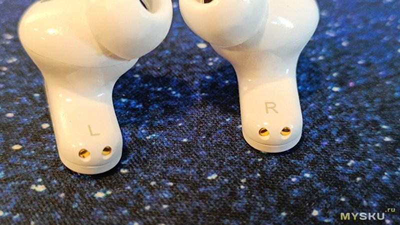 В нижней части «ножки» находятся металлические контакты для зарядки наушников внутри кейса. Там же нанесены крупные символы L и R, перепутать наушники будет сложно.