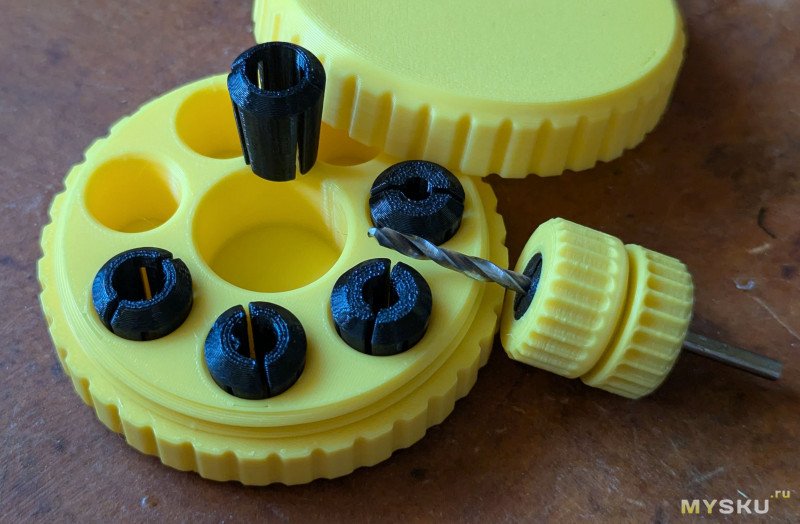 На сверло поначалу надевается со значительным усилием, потом гораздо легче. На сверле 3 мм смотрится довольно громоздко.