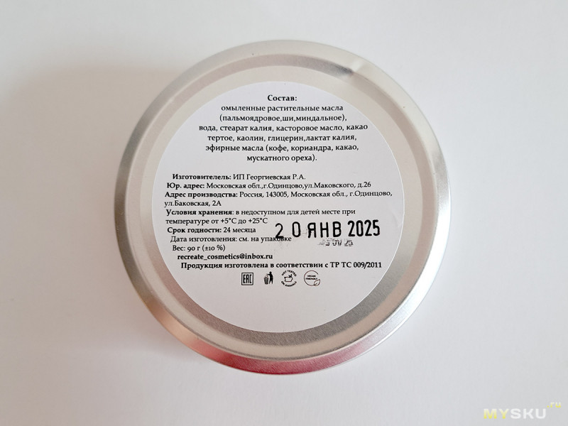 Мыло упаковано в алюминиевую банку. Диаметр 85 мм, высота 33 мм.