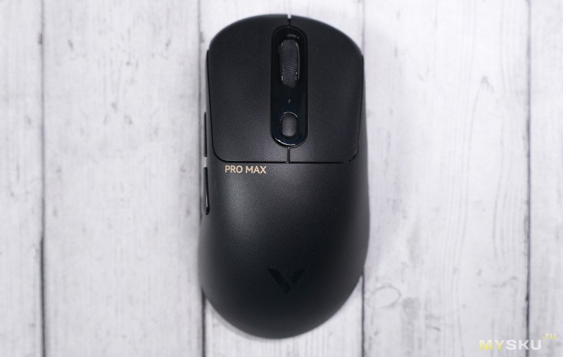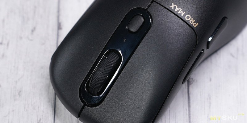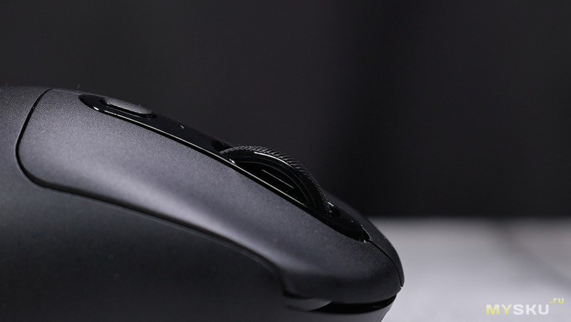 Наверху — всё по классике: две большие клавиши с кликом на Omron'овских переключателях с ресурсом до 60млн., кнопка переключения пресетов DPI с индикаторным светодиодом и колёсико с резиновым протектором.