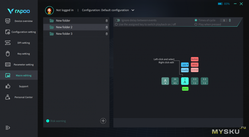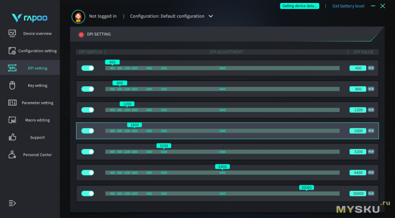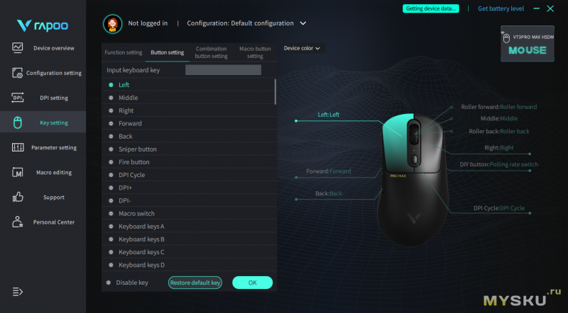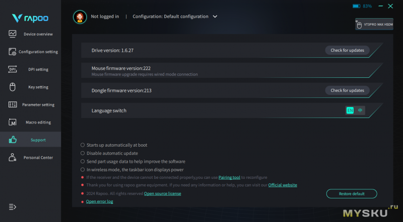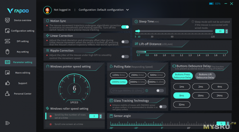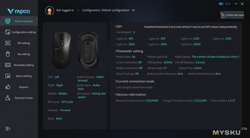 Из примечательного можно выделить настройку частоты опроса, DPI (даже отдельно по осям XY), перепрограммирование кнопок + макросы, настройка спящего режима, функция LiftOff для настройки высоты отработки движения мышью, сглаживание траектории движения мышью при тряске. На предпоследней вкладке можно обновить прошивку мыши. Надо сказать, что в мыши есть встроенная память и настройки после выключения все сохраняются.