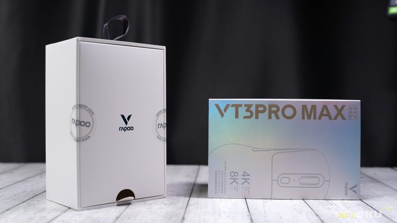 Мышь поставляется в приличной коробке с обозначением модели крупным шрифтом, при том название бренда написано мелким в уголке. Надписи 4К и 8К — не разрешение видео, как может показаться, а сокращённые обозначения поддержки частот опроса до 4000Гц и 8000Гц.