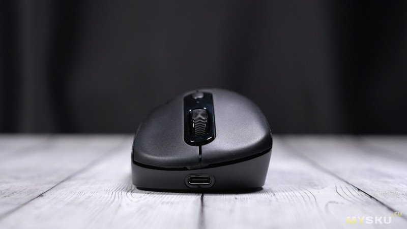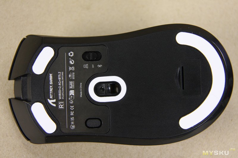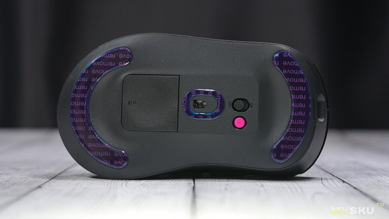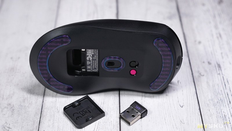 На донной стороне мыши находятся ножки (две полукольцами и одно в виде кольца вокруг сенсора). Сенсор «породистый» — от PixArt PAW3350 с максимальным разрешением до 30000 DPI. Также здесь находится рычажок включения/выключения мыши и дополнительная программируемая кнопка.