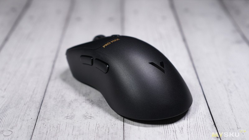 Мышь в профиль сзади имеет расширяющуюся к основанию форму грибной шляпки с завалом в правую сторону. На корпусе можно заметить глянцевую букву V, обозначающую принадлежность мыши к игровой серии мышей.