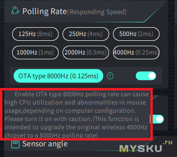 Рядом с частотами опроса в скобках также указывается и время отклика, чем выше частота, тем меньше время отклика. При выборе 8000Гц появляется предупреждение, что в этом режиме возможна нестабильная работа и повышенyая нагрузка на CPU.