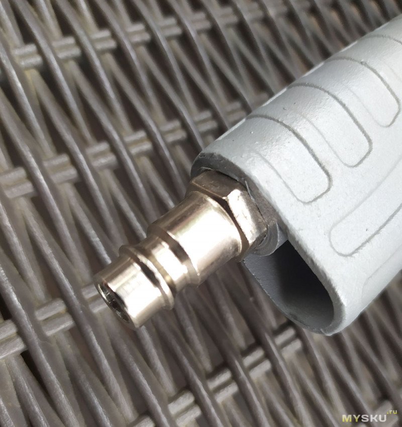 Чтобы начало нормально «сосать» из емкости, на подобных пистолетах иногда удлиняют воздушную трубку внутри пистолета (она бывает слишком короткой), но в нашем случае она практически нужной длины, не буду ее трогать