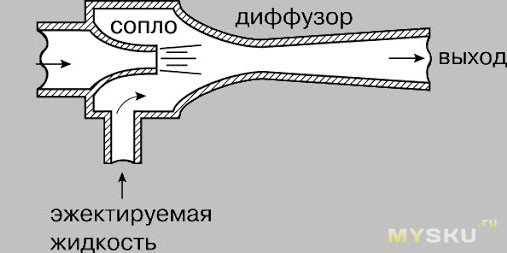 В нашем случае, предположительно диффузор слишком заужен и часть воздуха не успевая выходить через основное направление, вместо инжекции уходит вниз к жидкости